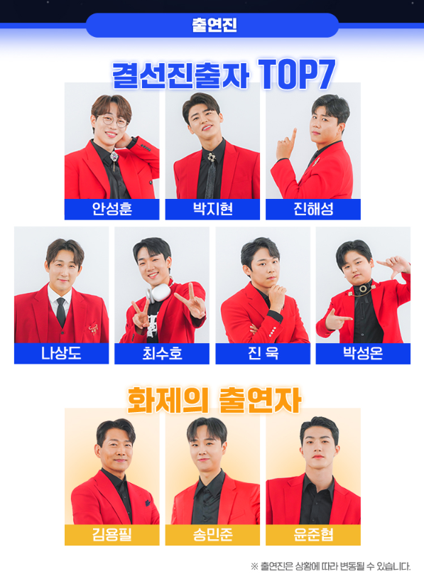 서울콘서트의 확정된 출연진은 미스터트롯2의 Top7인 안성훈, 박지현, 진해성, 나상도, 최수호, 진욱, 박성온입니다.