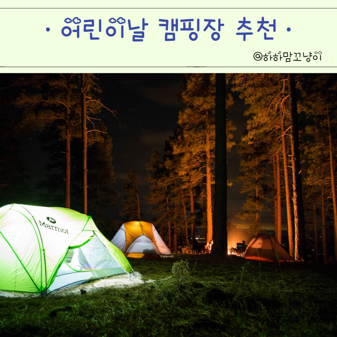 가족행사가 많은 가정의 달인 5월이 성큼 다가왔어요. 아이들과 어디를 가면 좋을까 고민하시는 분들 많으실텐데, 아이들이 좋아할만한 캠핑장을 한번 소개해볼까 해요. 5월 5일이 얼마남지 않았으니, 서둘러 예약하셔서 즐거운 시간 보내시길 바랍니다.