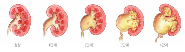 3단계 : 신우와 신배의 확장, 4단계 : 신우와 신배의 확장 + 신장 실질 두께가 정산의 50% 이하로 감소